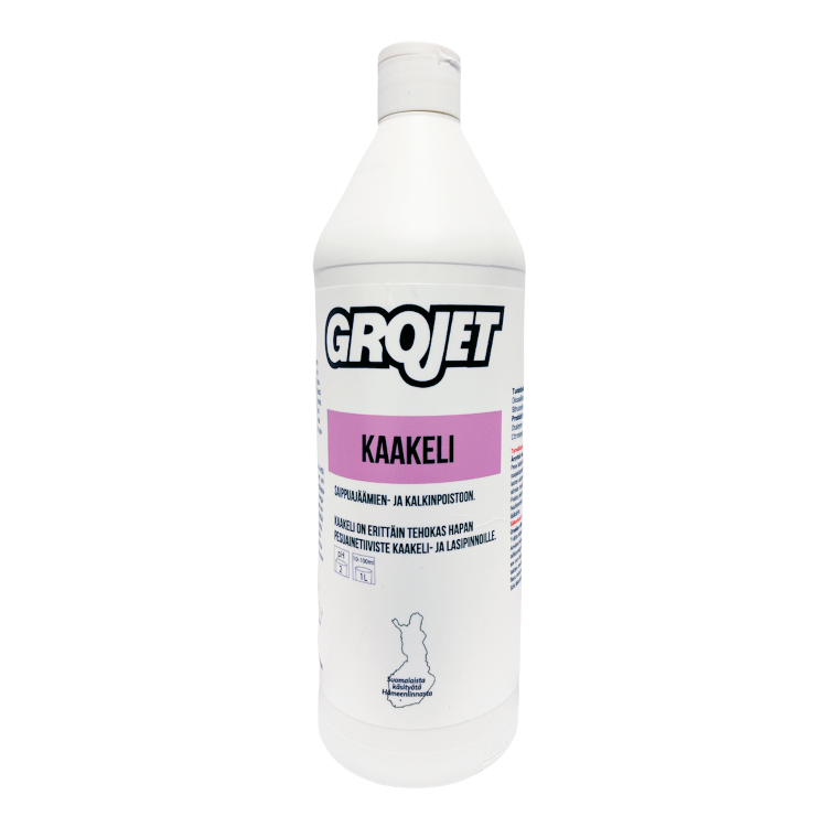 Grojet Kaakeli on hapan, pH2, ekologinen kylpyhuoneen monitoimipesuainetiiviste. Sillä voit puhdistaa kaakelilattiat ja -seinät sekä pestä kaikki lasipinnat puhtaaksi saippua- ja kalkkijäämistä.