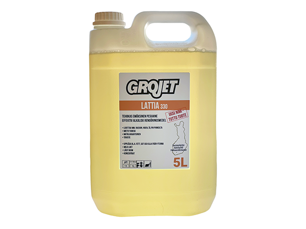 Grojet Lattia 330 on erittäin tehokas, matalavaahtoinen pesuainetiiviste, kun tarvitaan pesutehoa ja helppoutta pesussa. Poistaa tehokkaasti öljyä, rasvaa, nokea yms. likaa. Ei vahingoita maali-, muovi- eikä kumipintoja. Ei sisällä haitallisia liuottimia. Mieto tuoksu. Ei sisällä fosfaatteja.